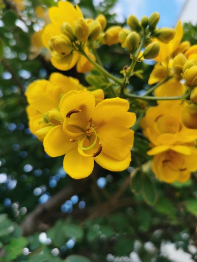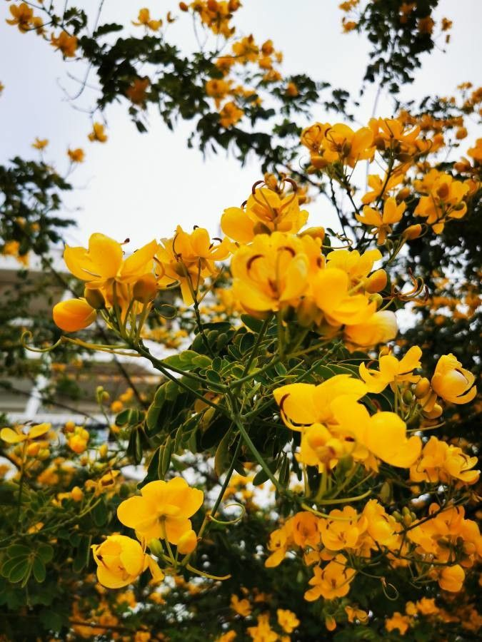 Arbusto o arbolito ornamental de porte redondeado, con abundante floración amarilla en racimos durante la primavera y el verano. Atrae polinizadores y aporta un toque vibrante y tropical al jardín.