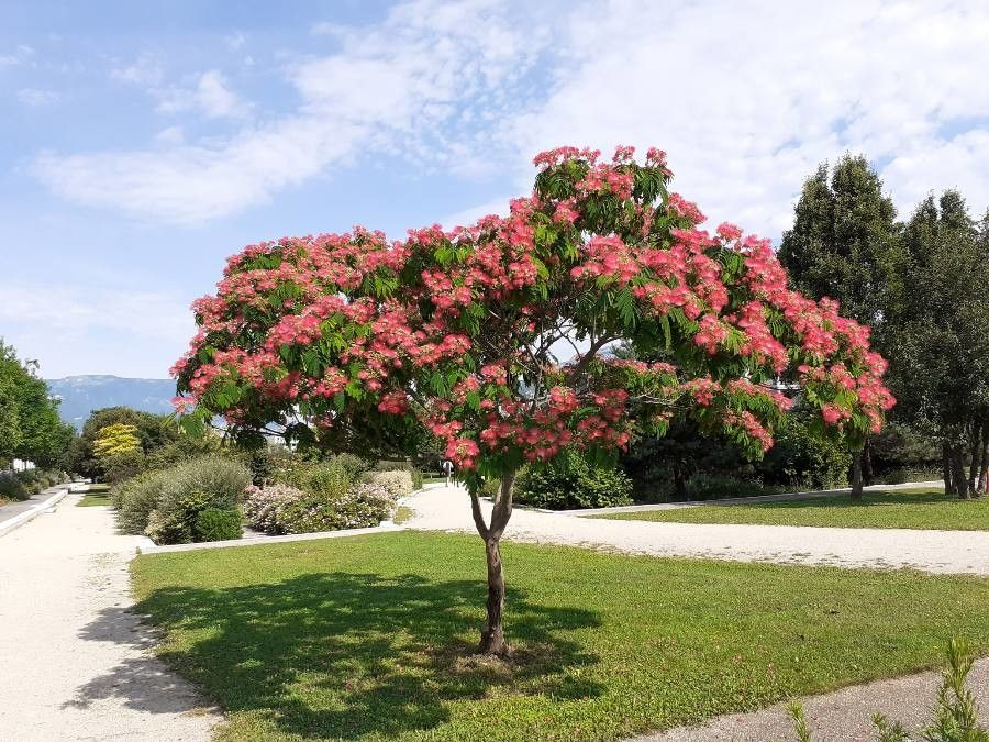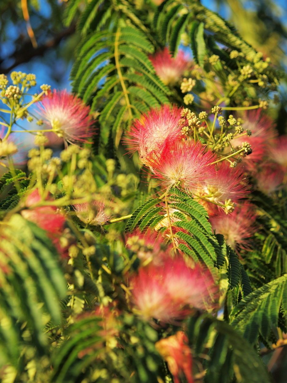 También llamada Árbol de Seda, es muy valorada por su copa extendida y flores rosadas en forma de pompones, que atraen mariposas.