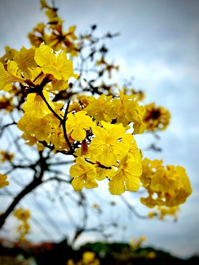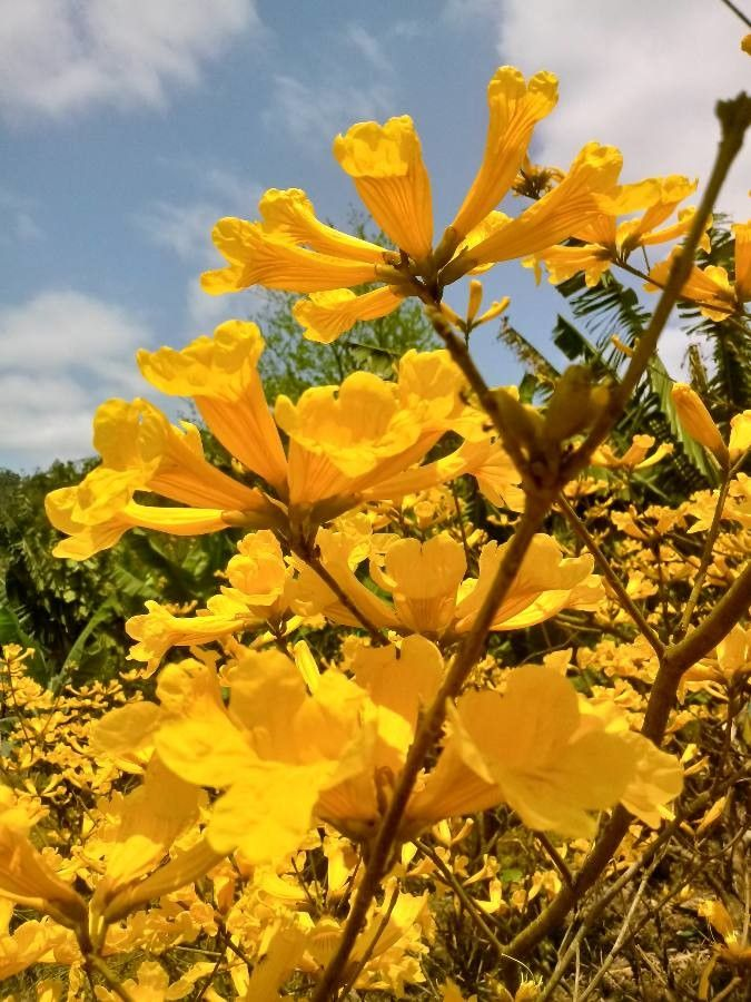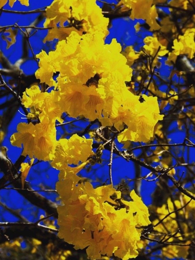 Árbol ornamental con flores amarillas brillantes; aporta color y sombra en parques y jardines grandes.