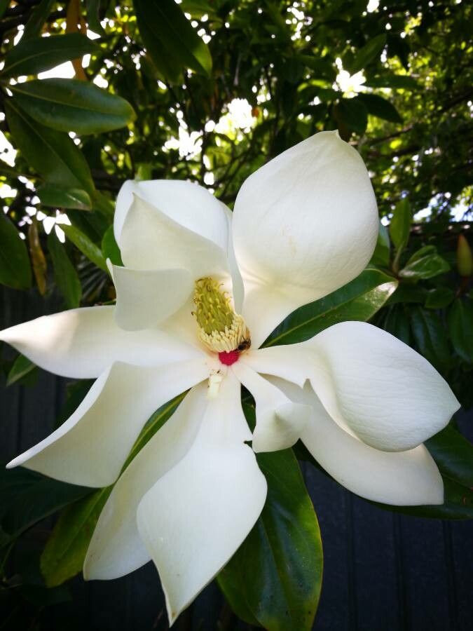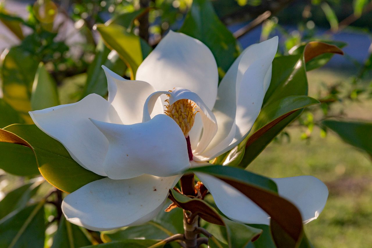 Árbol ornamental de gran porte con flores blancas y follaje perenne; aporta elegancia a parques y jardines.