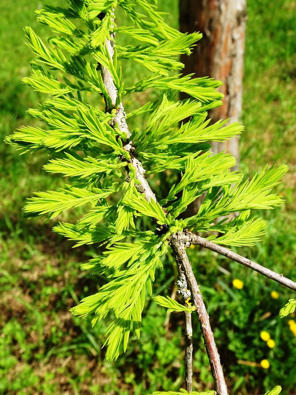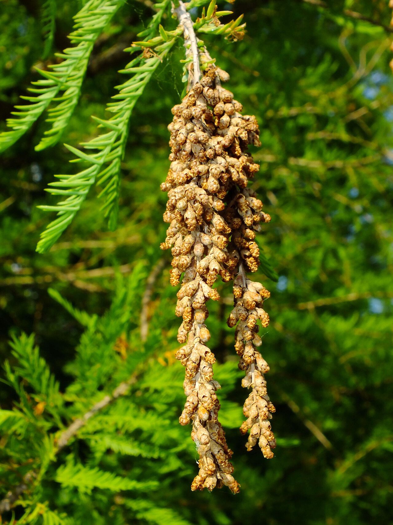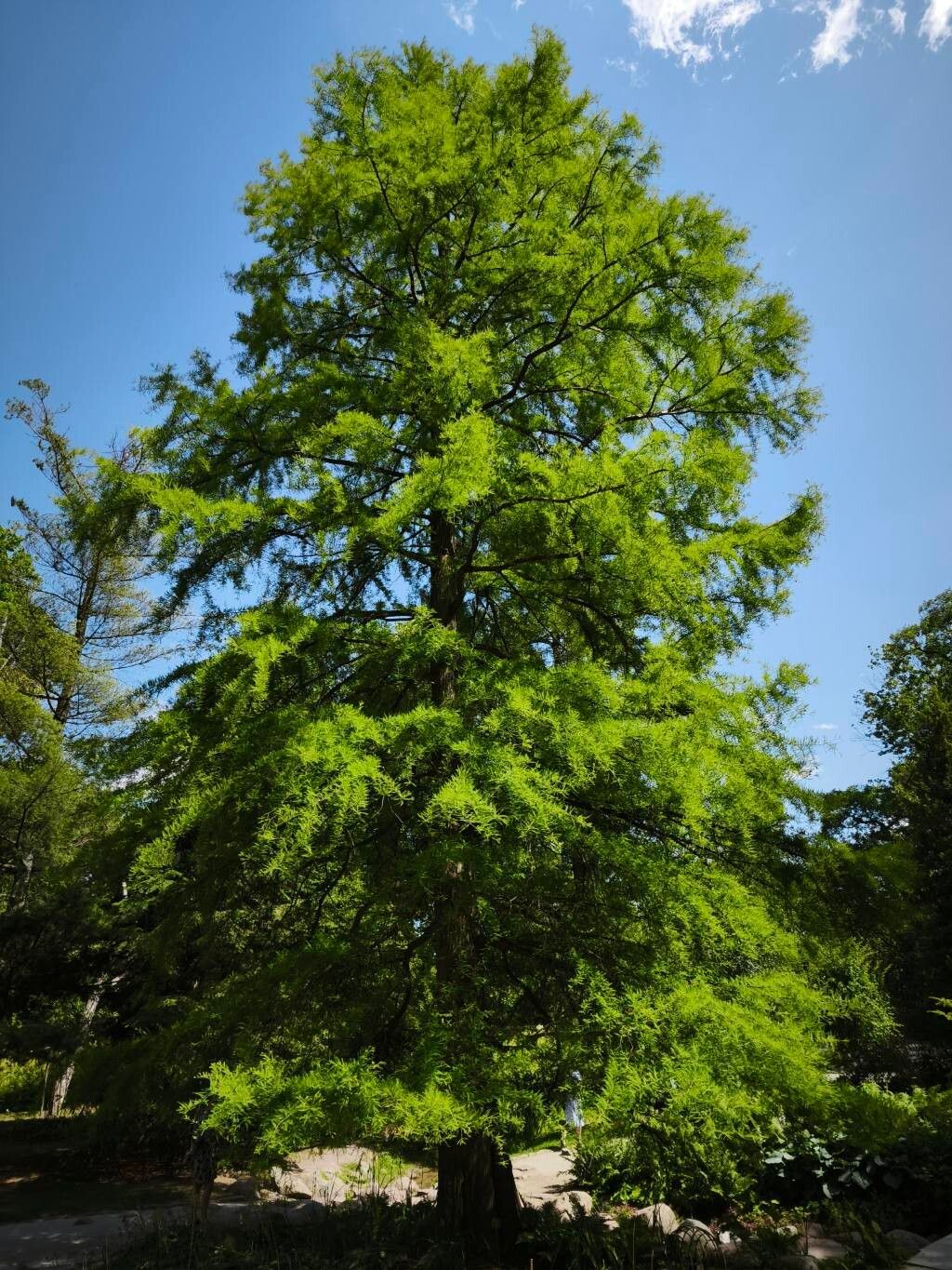 Conífera caducifolia de porte majestuoso y tronco ensanchado en la base. Tolera suelos húmedos y se destaca por su follaje que se torna cobrizo en otoño.