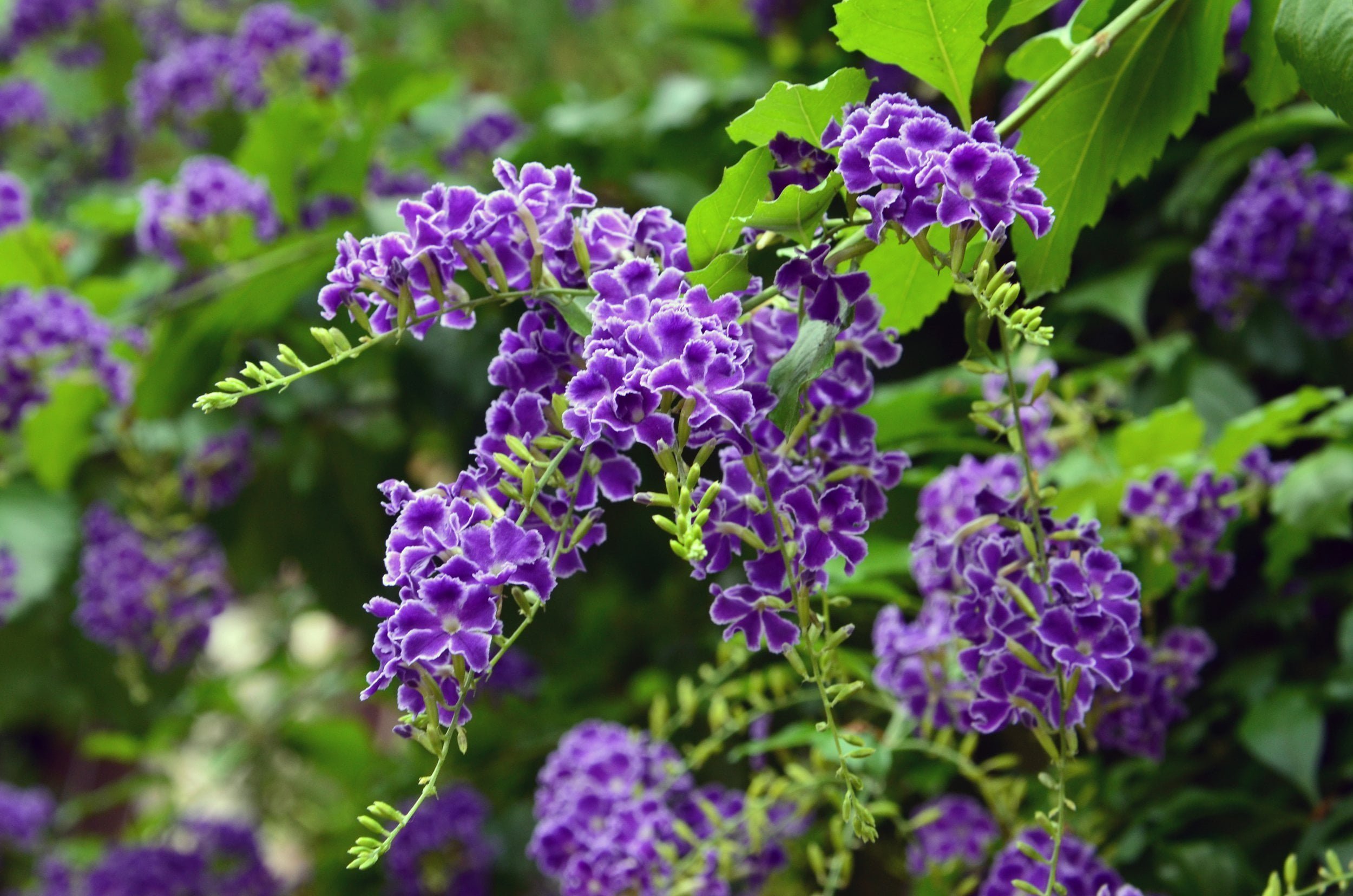Arbusto perenne de porte erguido y follaje denso, muy apreciado por su floración abundante y decorativa. Sus hojas son pequeñas, verdes y brillantes, y durante el verano produce racimos de flores lilas o violetas, seguidas de pequeños frutos amarillos o anaranjados que atraen aves.