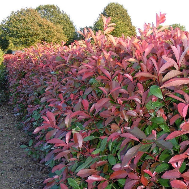 Arbusto perenne de crecimiento rápido y follaje denso, muy valorado por su atractivo ornamental y su capacidad para formar setos. Las hojas jóvenes son rojas brillantes, que con el tiempo se tornan verdes oscuras, creando un contraste llamativo durante todo el año. En primavera produce pequeñas flores blancas en racimos, seguidas de frutos rojos decorativos.