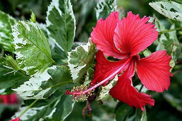 Arbusto ornamental de hojas brillantes y flores grandes y llamativas que florecen casi todo el año en climas cálidos. Aporta un toque tropical y vibrante al jardín.