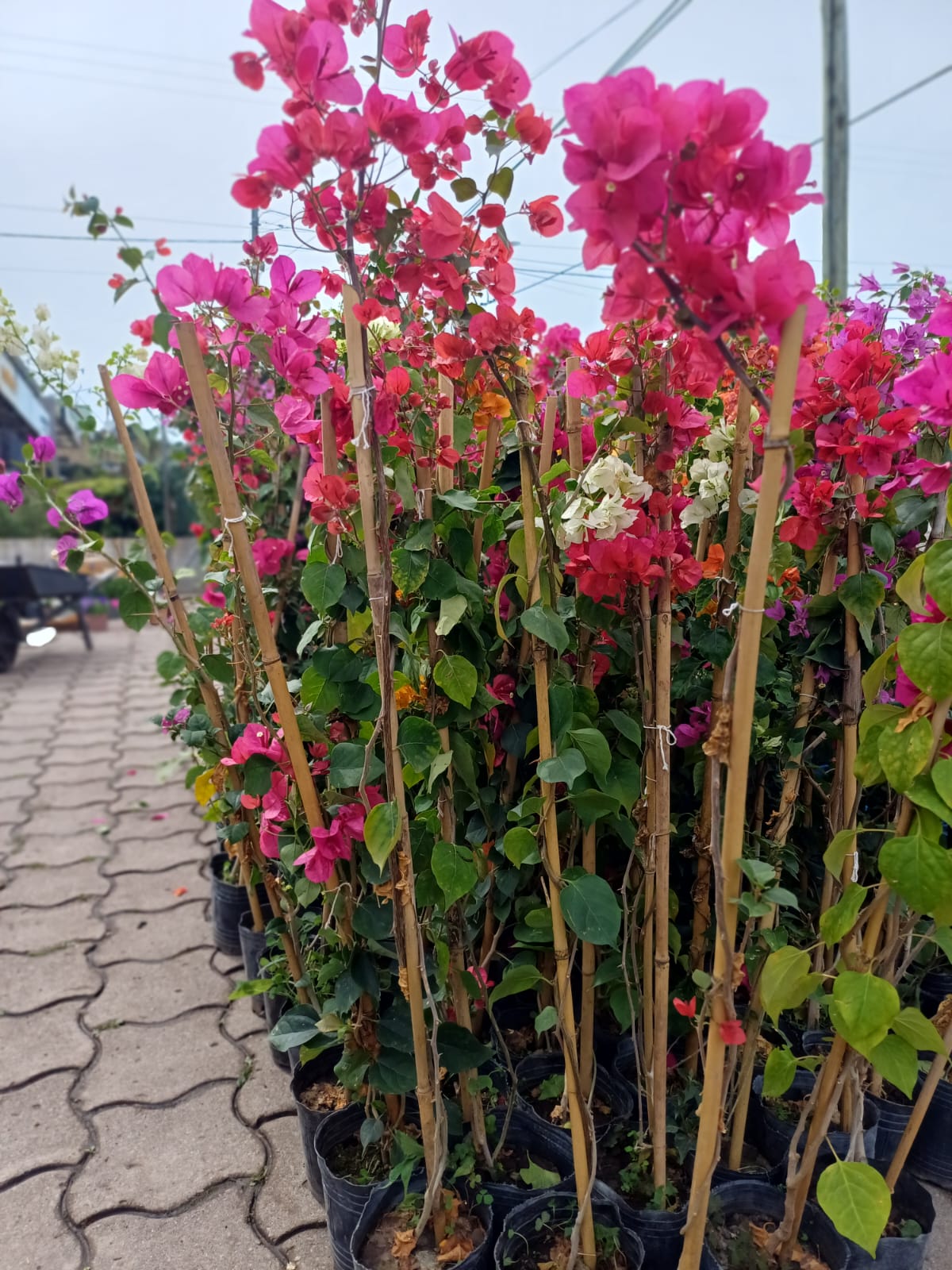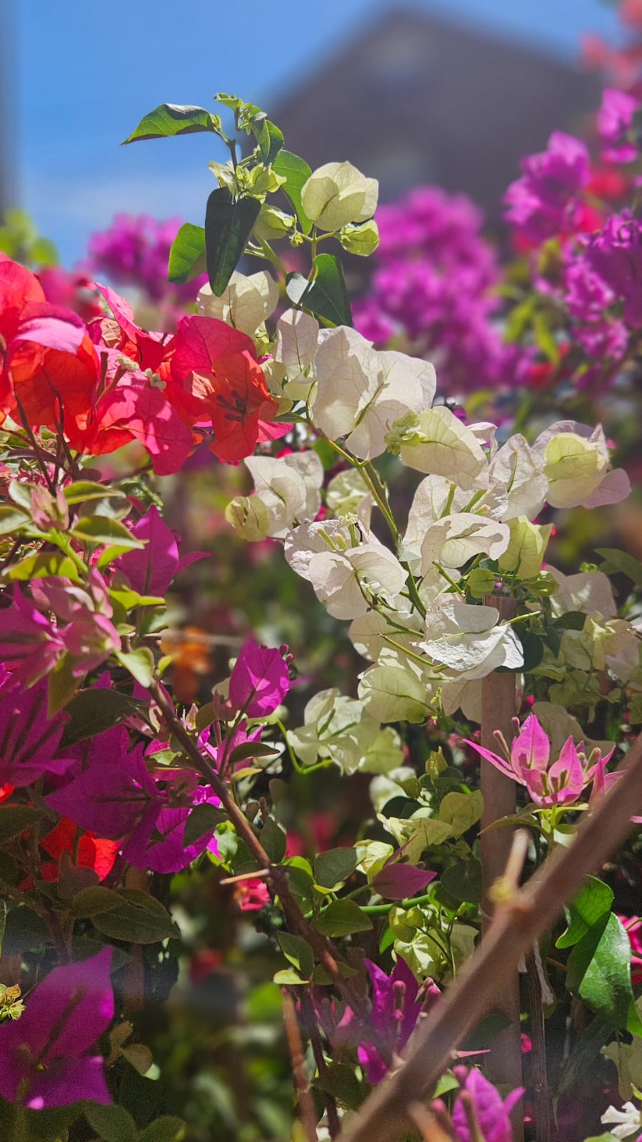 Trepadora vigorosa y espinosa, muy apreciada por sus brácteas de colores intensos que rodean pequeñas flores blancas. Ideal para muros, pérgolas y cercos soleados.