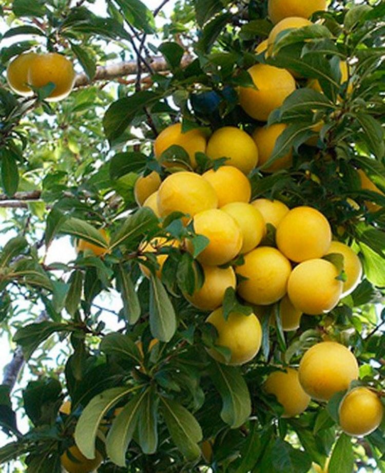 Frutal de hoja caduca con flores blancas y frutos amarillos dulces y jugosos, ideal para consumo fresco o dulces.
