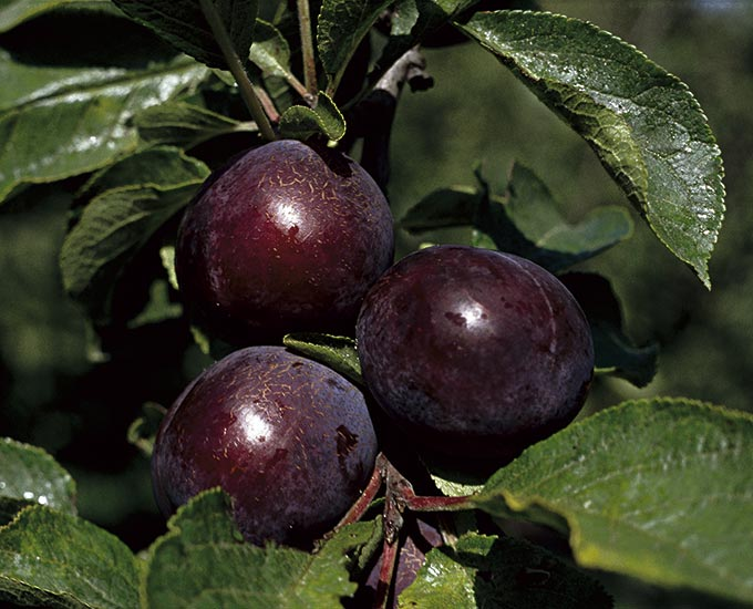 Árbol frutal de porte medio con frutos oscuros de sabor intenso, muy utilizados para mermeladas y postres.