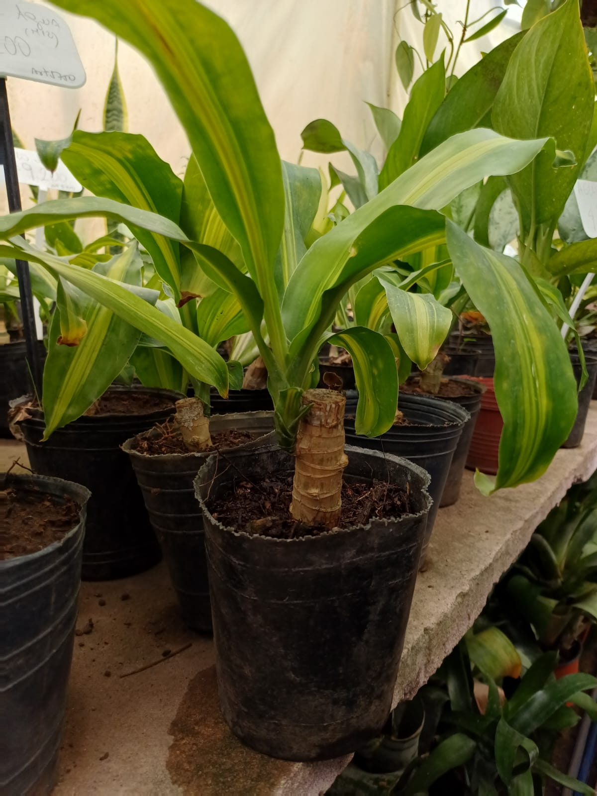 Planta tropical de hojas alargadas y brillantes con matices verdes y amarillos, muy resistente y ornamental.