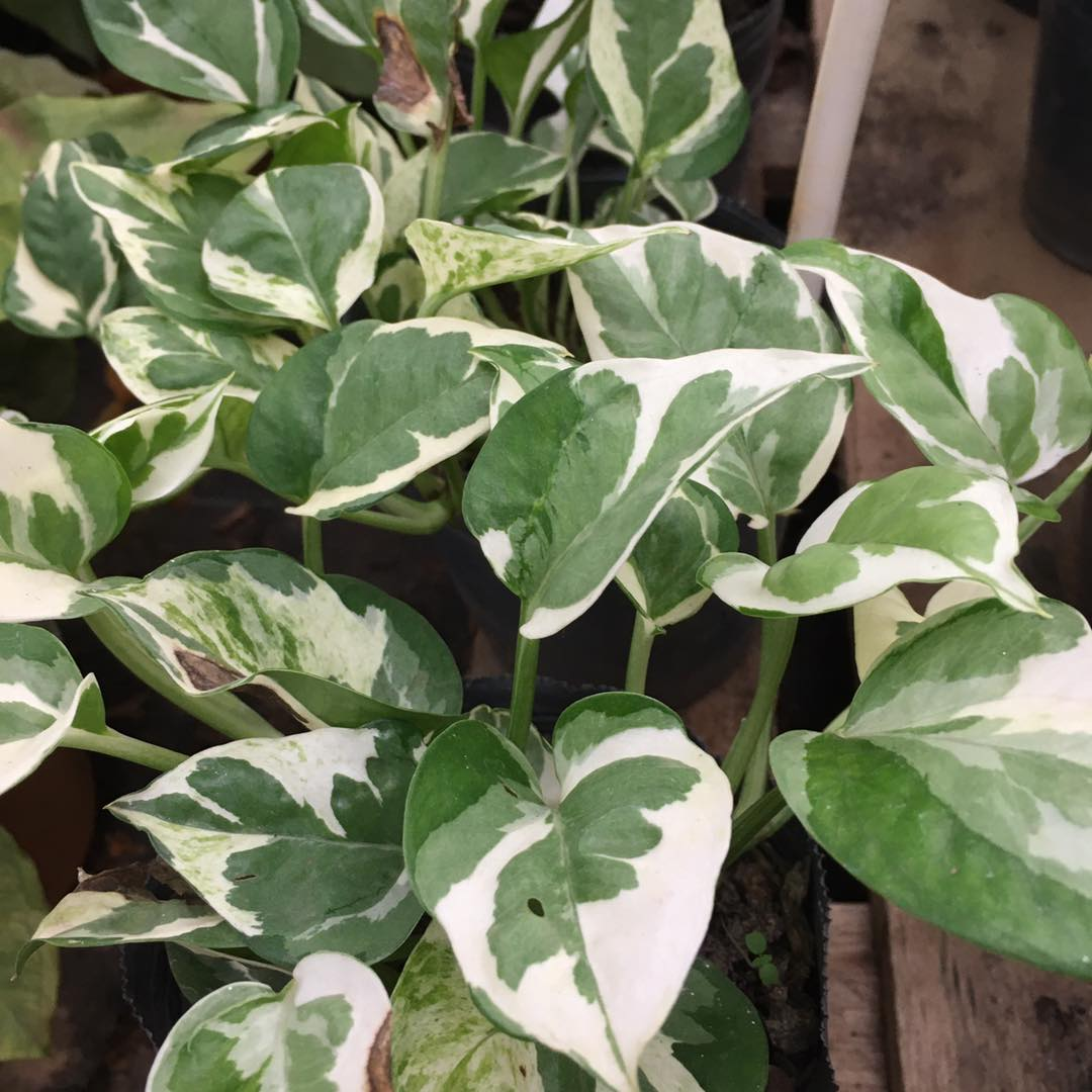 Planta trepadora o colgante de hojas verdes oscuro y manchas blancas, de crecimiento rápido y apta tanto para interiores como para exteriores protegidos.