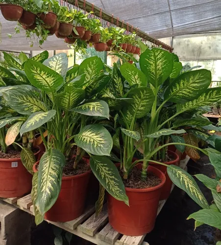 Planta de porte erguido y hojas largas verde oscuro con brillo intenso, muy usada para interiores por su resistencia y elegancia tropical.